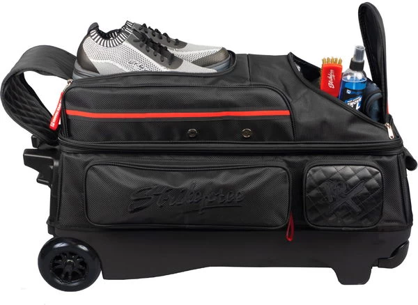 Show up to the lanes in style and performance with the KR Strikeforce Diamond Triple Roller! This premium quality bag made of 1680D ballistic fabric comes with 5″ Smooth Kruze urethane wheels with steel bearings for an ultra smooth quiet ride. The leather accent panels and YKK luggage zippers with custom “No Open Frames” zipper pulls gives it style and flash. The Diamond has more then enough room for your three bowling balls, shoes and accessories!